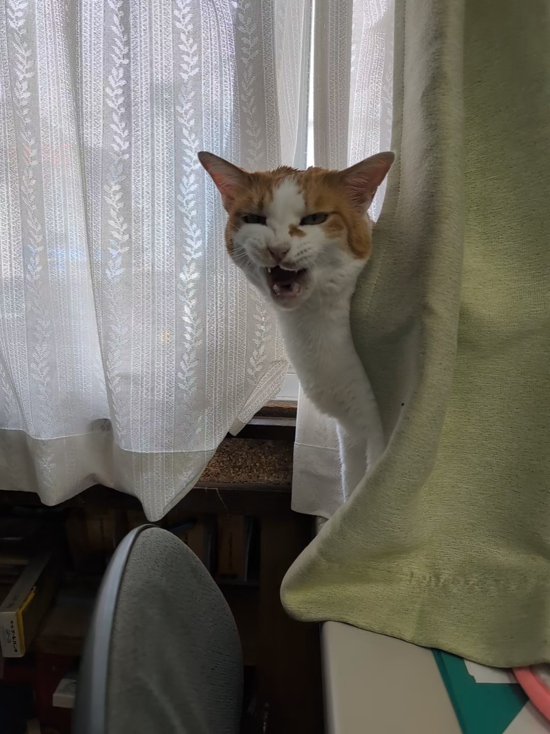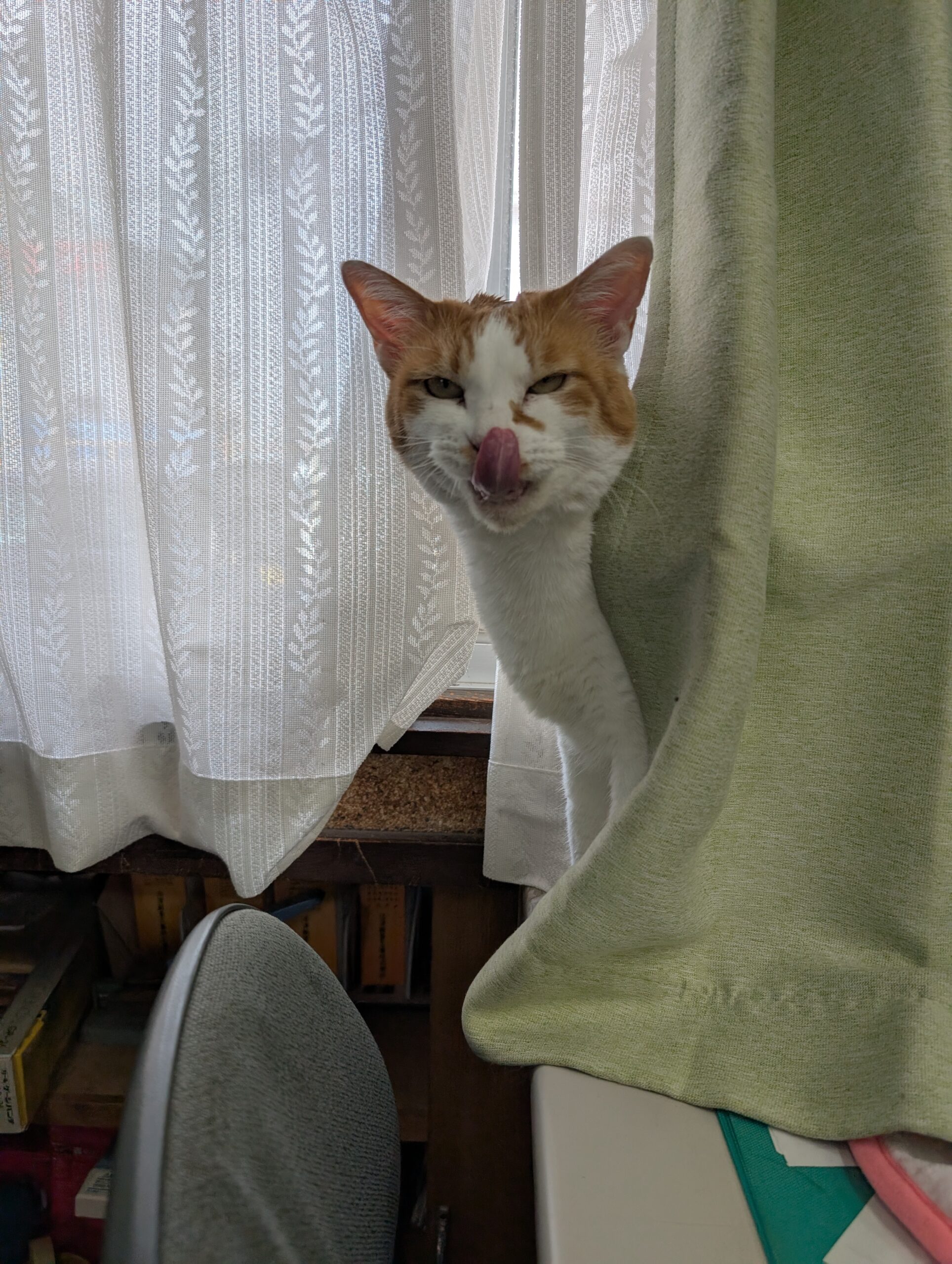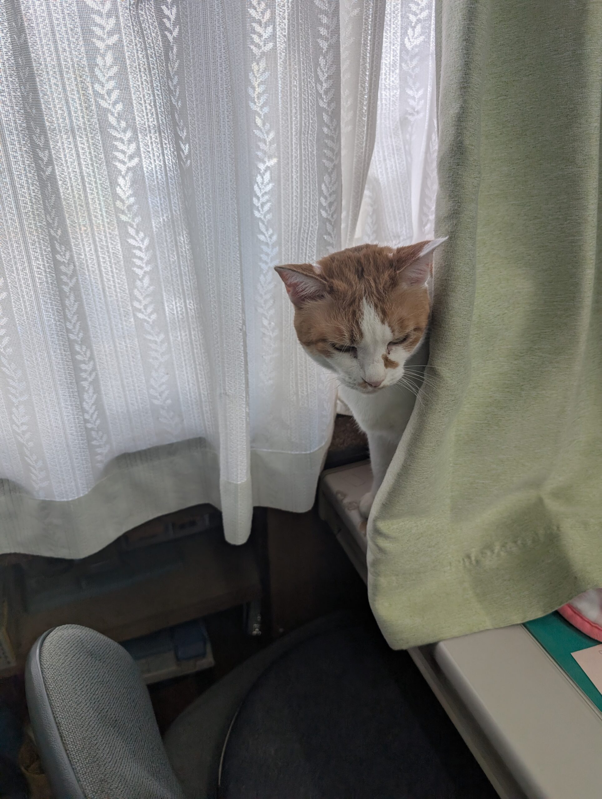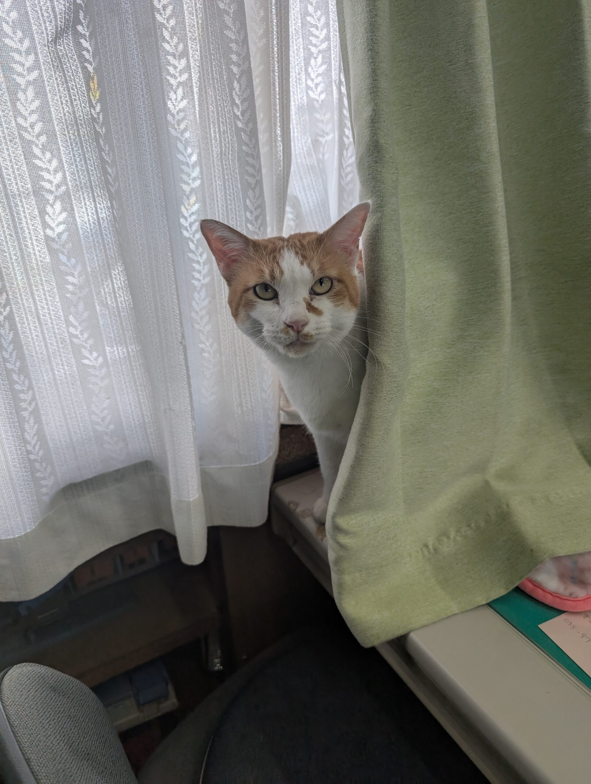 夏の間は、カーテンの中が日差しいっぱいで暑い為、居付かなかったカーテン裏・・・
