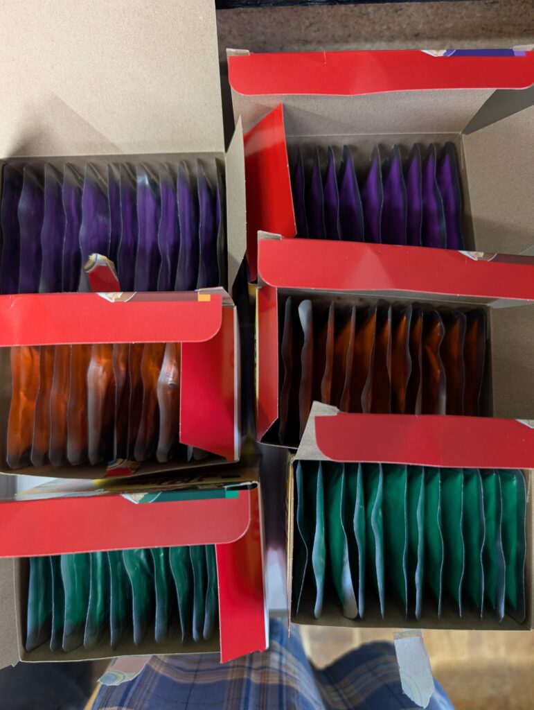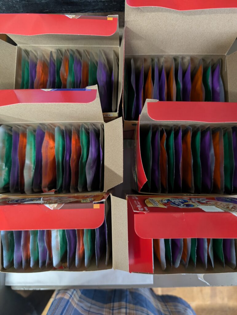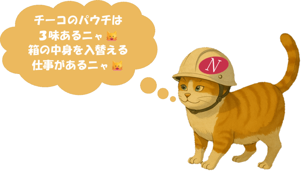 ネコファーストな弊社では、チーコの為に購入した箱から味が交互に食べられるようにパウチの入替え作業があります。
