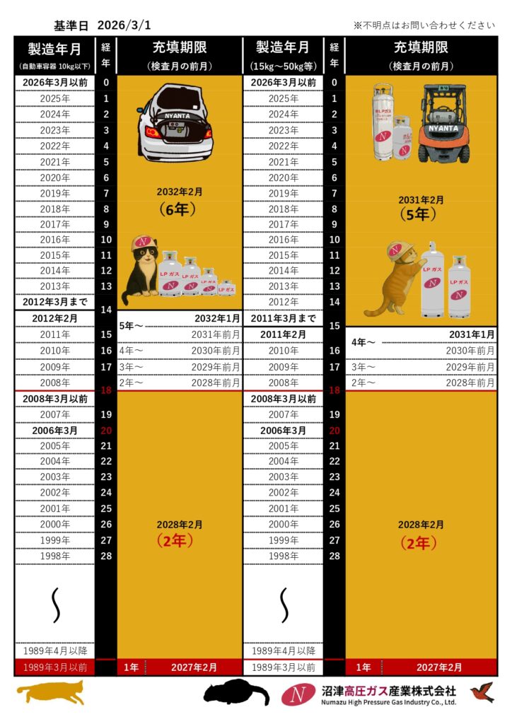 チーコとクロが登場する 弊社オリジナルの充填期限早見表(基準日:2026年3月1日版) を作成しました😼😼