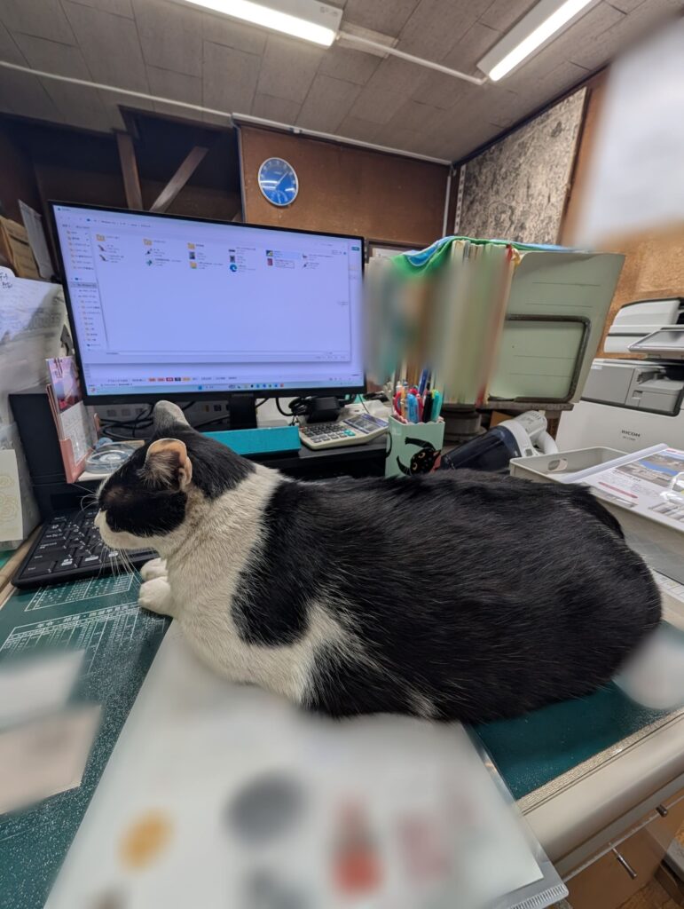 光の差し込む事務所で、存在感を全力で発揮するクロ。